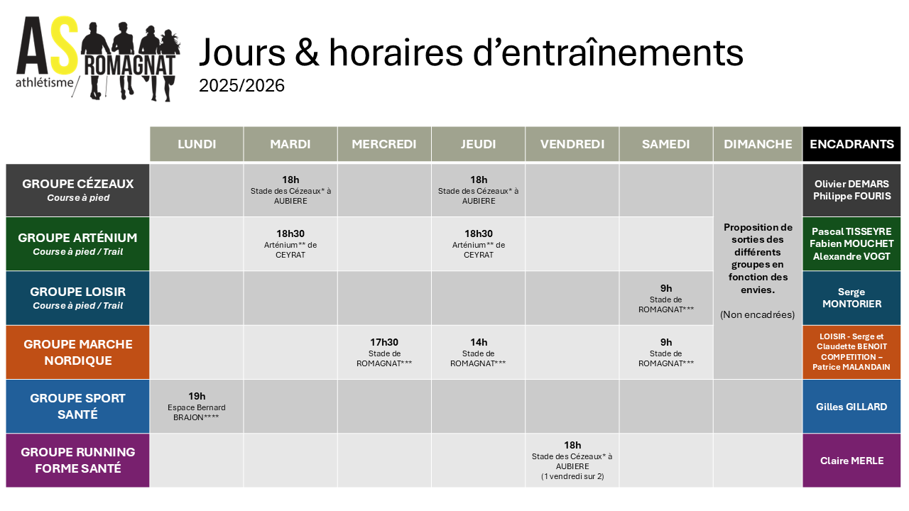 Voici les horaires et jours d’entraînement de l’AS ROMAGNAT Athlétisme pour la saison 2025-2026 :